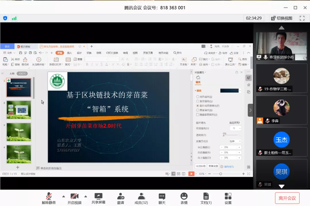 经前期筛选,最终确定14个参赛项目入围此次院赛。比赛采取云端会议的形式,分为“4分钟PPT汇报”、“现场答辩”两个环节。院赛伊始,各团队按抽签顺序依次从背景分析、项目介绍与分工、产品简介、产品定位、市场分析、经营模式等方面进行项目展示。项目内容涵智慧农业、乡村建设、中药抑菌产品开发、作物一体化智能管理等。其中,岁穗安康利用Fhb7小麦赤霉抗病品种及脱毒技术,助力粮食安全保障;瀚土农场给农业插上科技翅膀,推动农场互联网智能管理,运用“农机+农技”绘制农业现代化新蓝图;薪土相传发展合理耕层构建系统,将农作物秸秆残茬覆盖地表,减少土壤水蚀、风蚀,实现作物长期发展,达到节本增效、增产增收效果。在答辩环节中,评委老师结合当前形势对各项目进行提问点评,并给出建设性意见,为项目后期优化提供清晰思路。