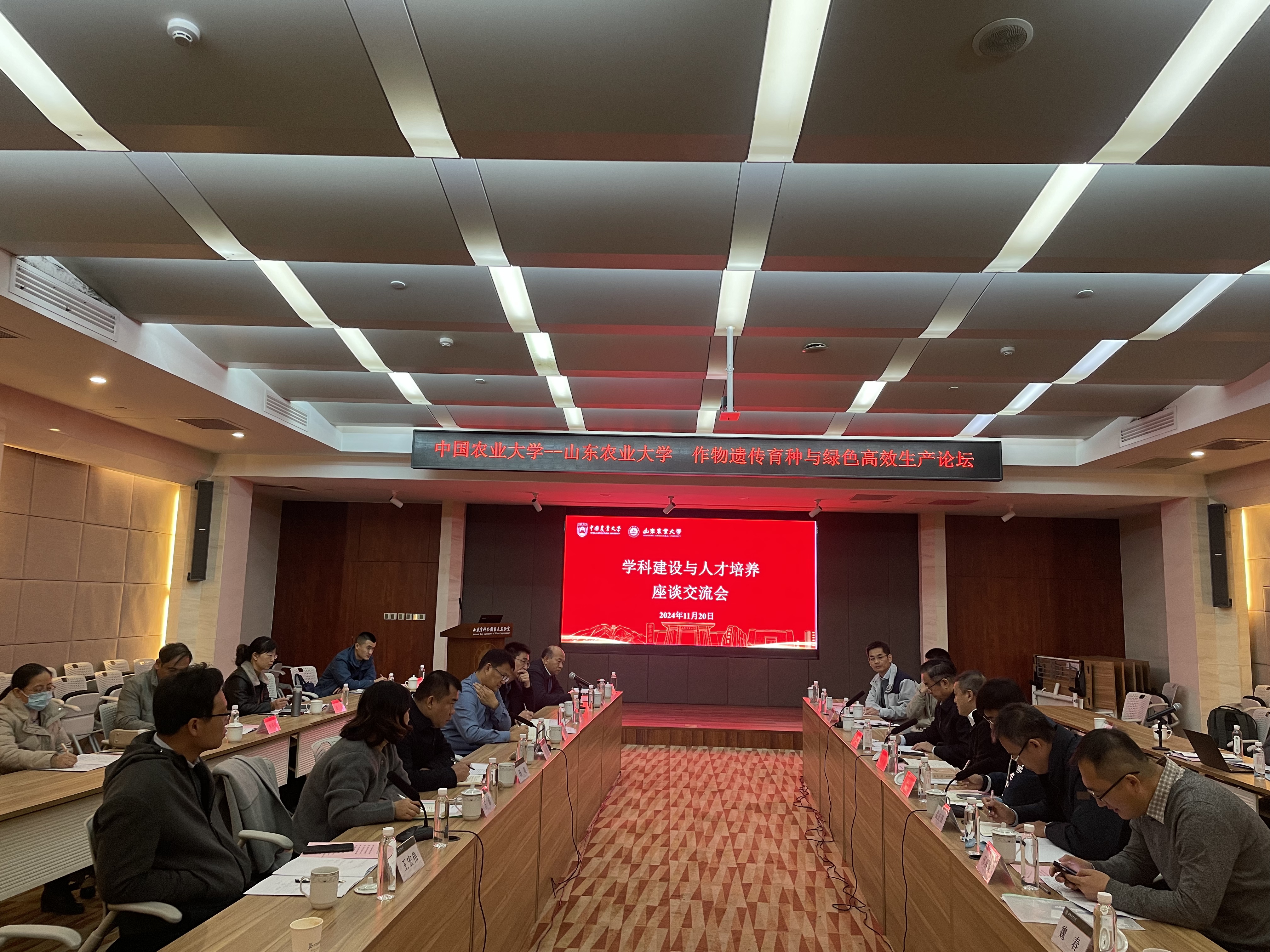 11月20日,中国农业大学与山东农业大学-作物遗传育种与绿色高效生产论坛在登高楼一楼报告厅举行。上午,学校党委常委、副校长王勇,“齐鲁粮仓”发展战略研究中心主任、中国农业大学国家农业科技战略研究院院长高旺盛教授,中国农业大学农学院倪中福院长,及学校科技处、发规处、人事处和站园中心等相关人员出席会议,围绕更高水平齐鲁粮仓建设、学科建设和人才培养进行研讨交流。