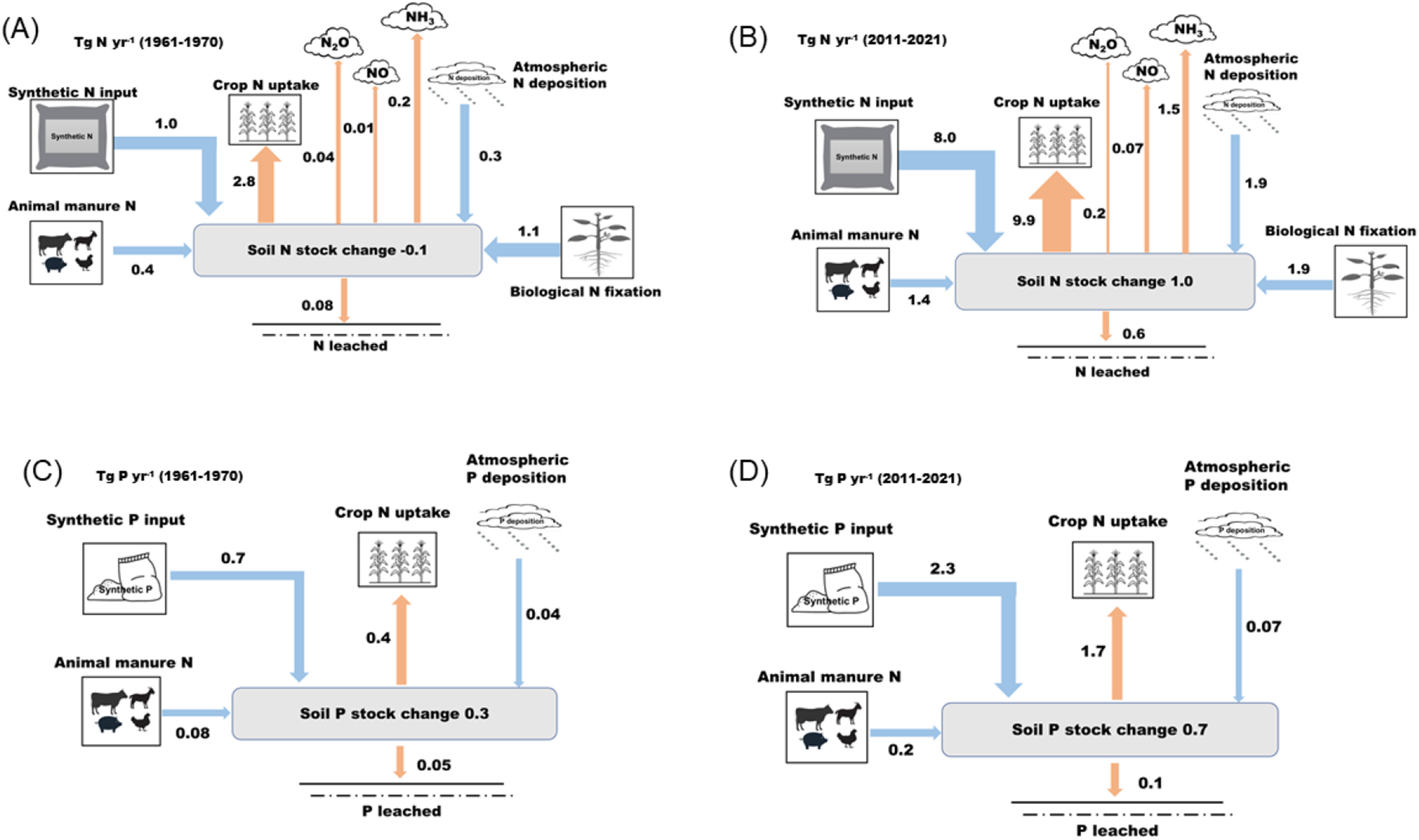 本研究系统分析了1961-2021年非洲各国家的氮磷养分流动动态及其驱动因素。结果表明,非洲农田氮输入量由17.9 kg ha-1增至46.9 kg ha-1,磷输入量由4.8 kg ha-1增至9.5 kg ha-1,但仍远低于全球平均水平。氮利用效率从91.3%下降至74.6%,而磷利用效率从57.8%上升至64.3%,可见非洲氮磷养分管理的不平衡性。目前北非农产品卡路里和蛋白质日供应量已达推荐量,但撒哈拉以南国家仍低于该值。人均GDP、能量供应与氮磷利用效率呈显著负相关,但依区域而异,未来需制定区域差异化的氮磷养分管理策略。